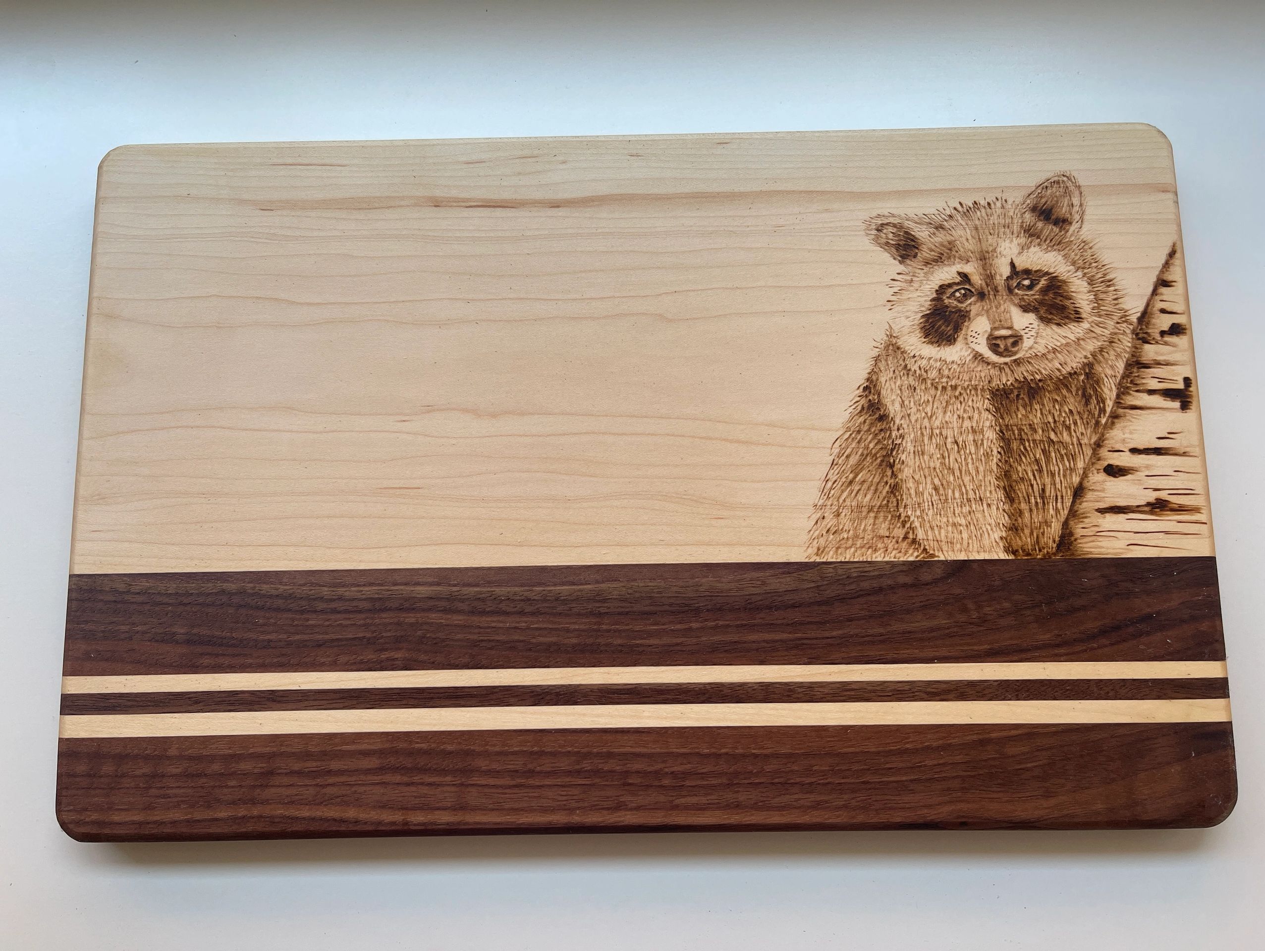Outdoor items such as bird feeders or squirrel feeders have keyhole slots cut in the back and can be mounted on tree trunks, fences or deck railings. Indoor items are used for cheese or charcuterie boards, table centrepieces or wall décor.
